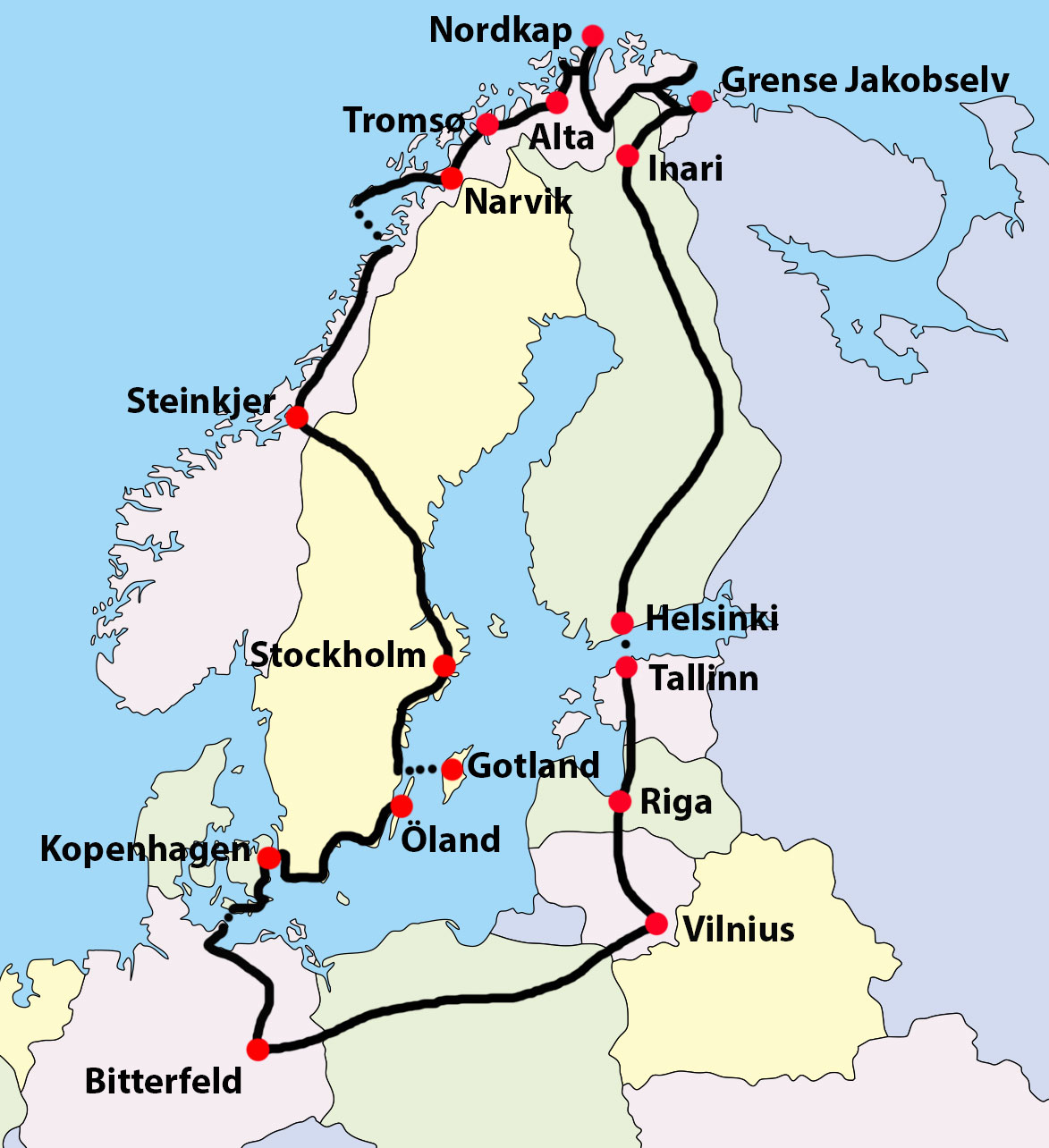 Vor allem die vielen einzigartigen Naturerlebnisse prägten diese abenteuerliche Tour; aber auch mit Wetterextremen, wie Kälte, Sturm und heftigen Regenfällen wurde der Radreisende konfrontiert. Er unternahm Exkurse in die jeweilige Landesgeschichte und besuchte die interessanten Inseln Gotland und Öland, sowie die modernen Hauptstädte Stockholm und Kopenhagen.