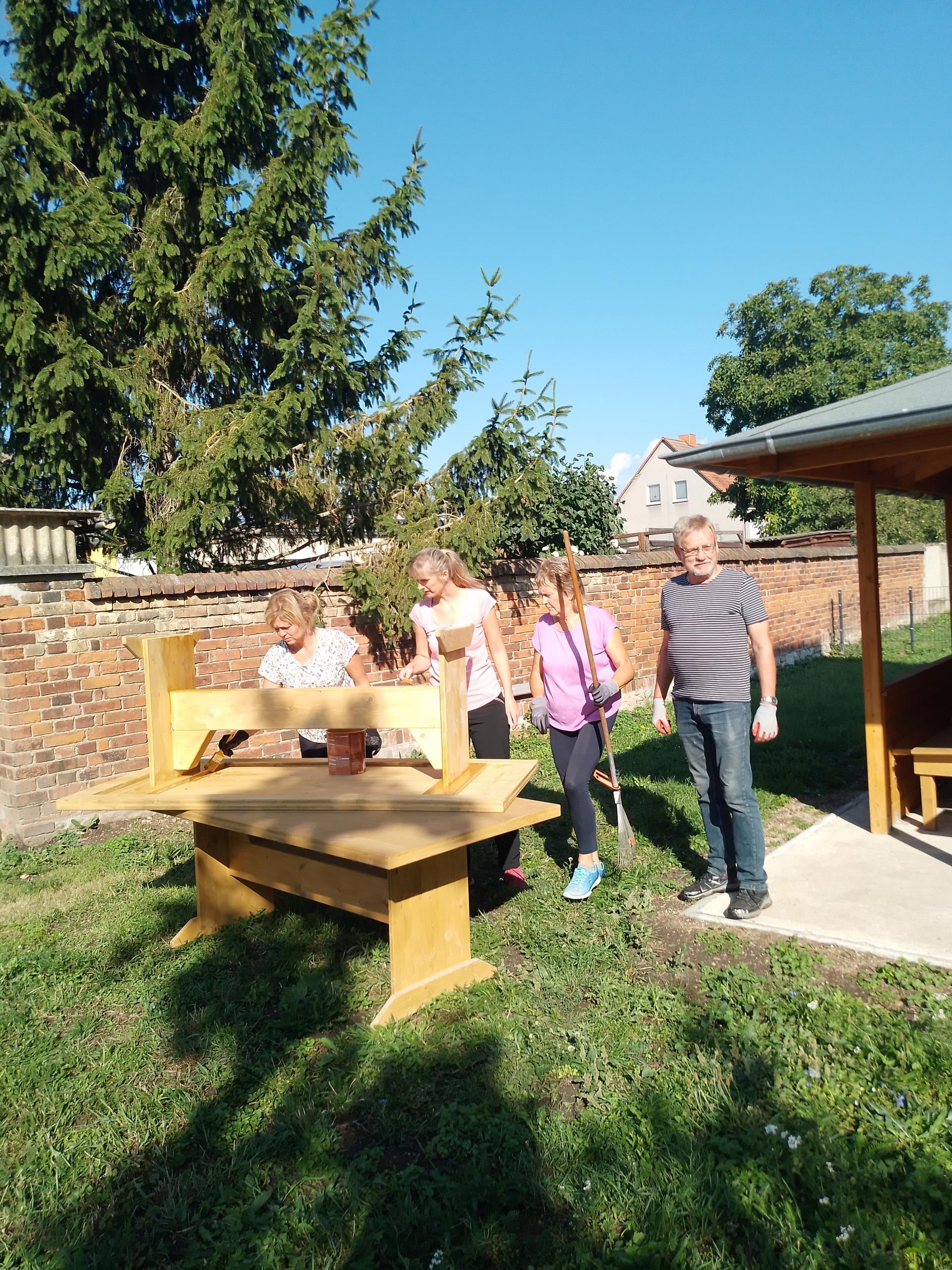 Die Trebnitzer legten noch eine Schippe drauf: Das Wort "Aktionstag" nahmen sie wohl wörtlich, denn hier startete man ebenfalls bereits um 09:00 Uhr - die "Grundreinigung" dauerte aber bis 17:00 Uhr. 15 Trebnitzer im Alter von 8 bis 85 Jahren gingen noch weiter, als "nur" Müll zu sammeln. Es wurden der Container sowie die Tische und Bänke der Schutzhütte gestrichen, der Spielplatz gereinigt, Büsche verschnitten und Gehwege und Straßen von Unkraut befreit. Das anschließende Beisammensein mit Verpflegung hatten sie sich redlich verdient.