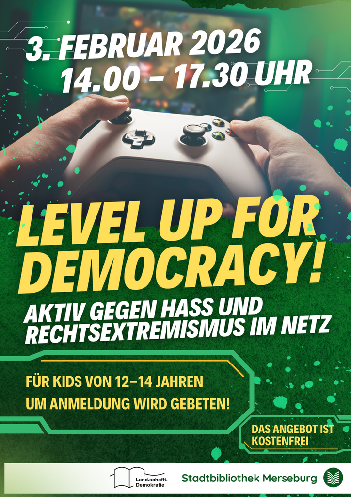 Workshop für Kids von 12 bis 14 Jahren „Level up for democracy! Aktiv gegen Hass und Rechtsextremismus im Gaming“ Gaming gehört für dich zum Leben? Die meisten Menschen zocken und haben Spaß an den Herausforderungen im Spiel, dem Teamwork mit Freund*innen und dem Abtauchen in neue Welten. Leider gibt es beim Gaming aber immer wieder auch Beleidigungen in Chats, Hate Speech in den Foren und teils auch rechtsextreme Memes und Mods. Im Workshop schauen wir uns an: Was sind Hate Speech und Rechtsextremismus und warum gibt es beides auch im Gaming? Wie kann aus Beleidigungen im Chat ein Nährboden für Hass und Hetze werden? Welche Codes und Symbole nutzen Rechtsextreme im Gaming? Wie kann ich dagegen aktiv werden? Mit interaktiven Übungen, Videos und Beispielen besprechen wir, wie du Hate Speech und rechtsextreme Inhalte durchschauen kannst. Du erfährst, welche Strategien es zum Schutz und Reagieren gibt und wie du dich stark machst für ein respektvolles Miteinander im Netz. So kann gutes Gaming für alle gelingen! Ein Workshop vom Violence Prevention Network im Rahmen von Land.Schafft.Demokratie. Noch freie Plätze - meldet euch direkt in der Bibliothek! Wann? 27.01.2026 | 14:30 - 17:00 Uhr |